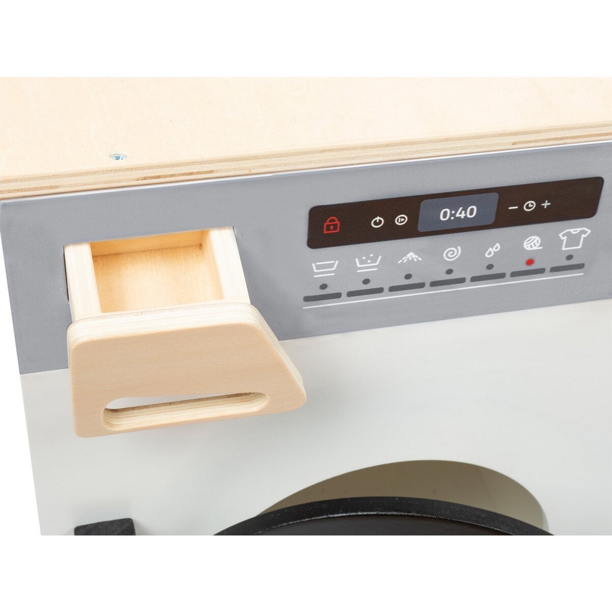 Deze grote, uitgebreid uitgeruste kinderkeuken biedt alle apparatuur van een modern huishouden met een fornuis, spoelbak, wasmachine/vaatwasser, magnetron, koelkast en oven. Dankzij het modulaire systeem kan het worden gebruikt als hoekkeuken, kitchenette of als keuken met werkeiland en biedt het ruimte voor meerdere kinderen voor creatief rollenspel. Draaiknoppen met klikgeluid en de verlichte kookplaat met kookgeluid zorgen voor realistisch speelplezier. Inclusief hoogwaardig metalen kookgerei. Batterijen niet inbegrepen. Het speelkeukentje heeft uitneembare opbergdozen. Dankzij de rechtlijnige vorm en het hoge aandeel zichtbaar hout heeft de kinderkeuken een hoogwaardige uitstraling in een moderne zwart-wit look.