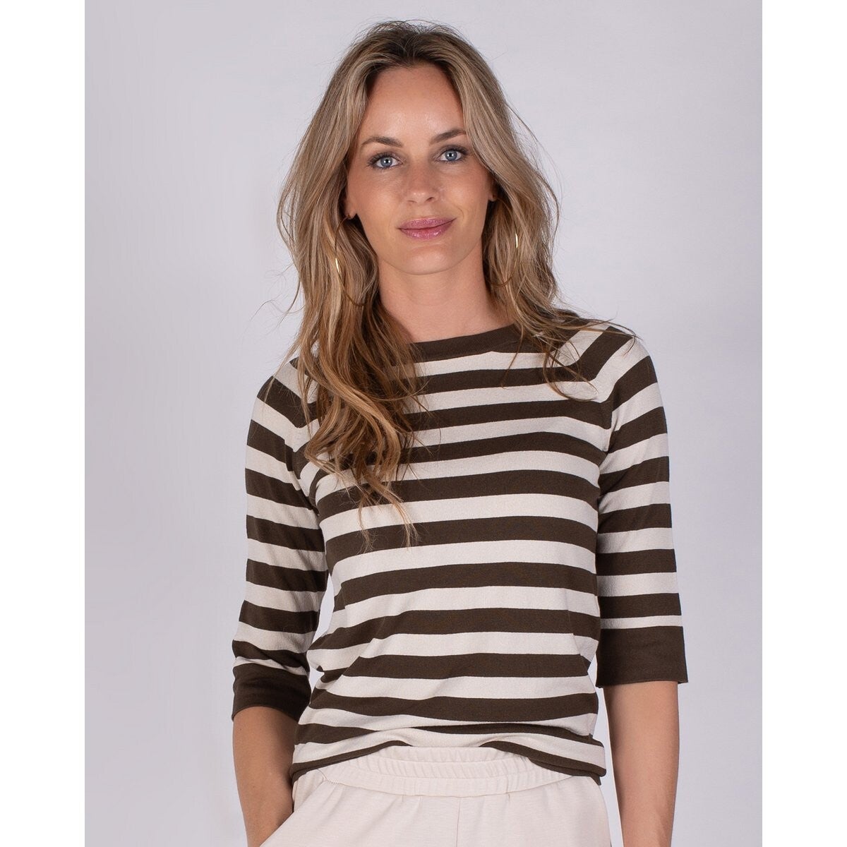 Dames trui taupe pale gestreept viscose ronde hals 1/2 mouw - MOSCOW