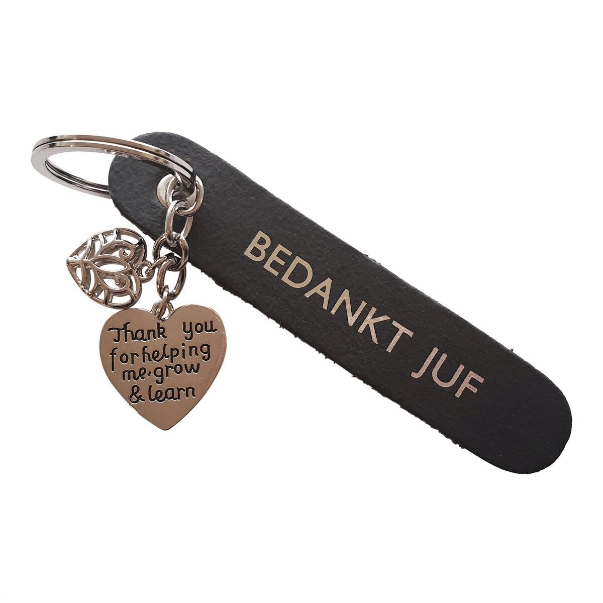 De sleutelhanger is bedrukt met de tekst: BEDANKT JUF