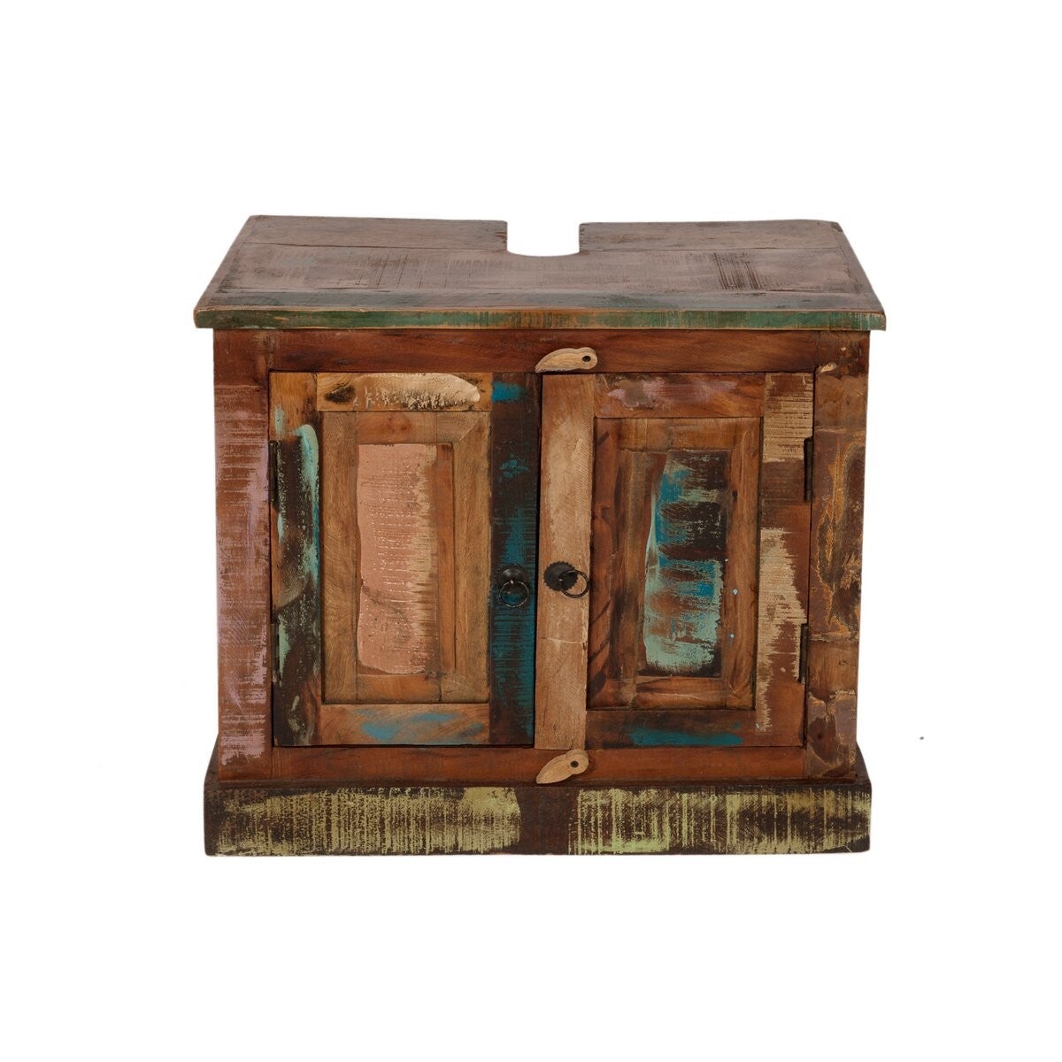 Deze wastafelkast is een echte eyecatcher in iedere badkamer. De afdekplaat werd voorzien van de nodige uitsparing voor de gootsteenafvoer. Binnen in het wastafelmeubel is achter de 2 deuren voldoende opbergruimte voor badkamerreinigers, schoonmaakspullen, toiletreinigers etc. Dit badkamermeubel is makkelijk te combineren met moderne badkamermeubels. Met zijn kleurrijk gelakte look is dit wastafelmeubel verre van onze vaak saaie perfectie en daarom werkelijk uniek. meubel meubels kast Gemaakt van FSC-gecertificeerd hout. geen vloer, met sifonuitsparing 16x6,5 cm, afmeting achter de deur 57,5/50,5x35x44/40,5 cm.