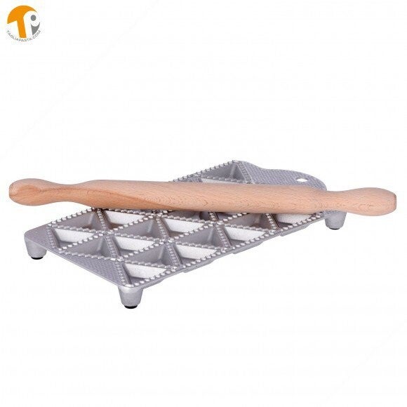 Aluminium Ravioli mal voorzien van kleine houten deegroller. Verzegelt snel en nauwkeurig 24 driehoekige ravioli met een zijde van 50 mm. Ook geschikt voor professioneel gebruik in restaurants en verse pastawinkels. keuken