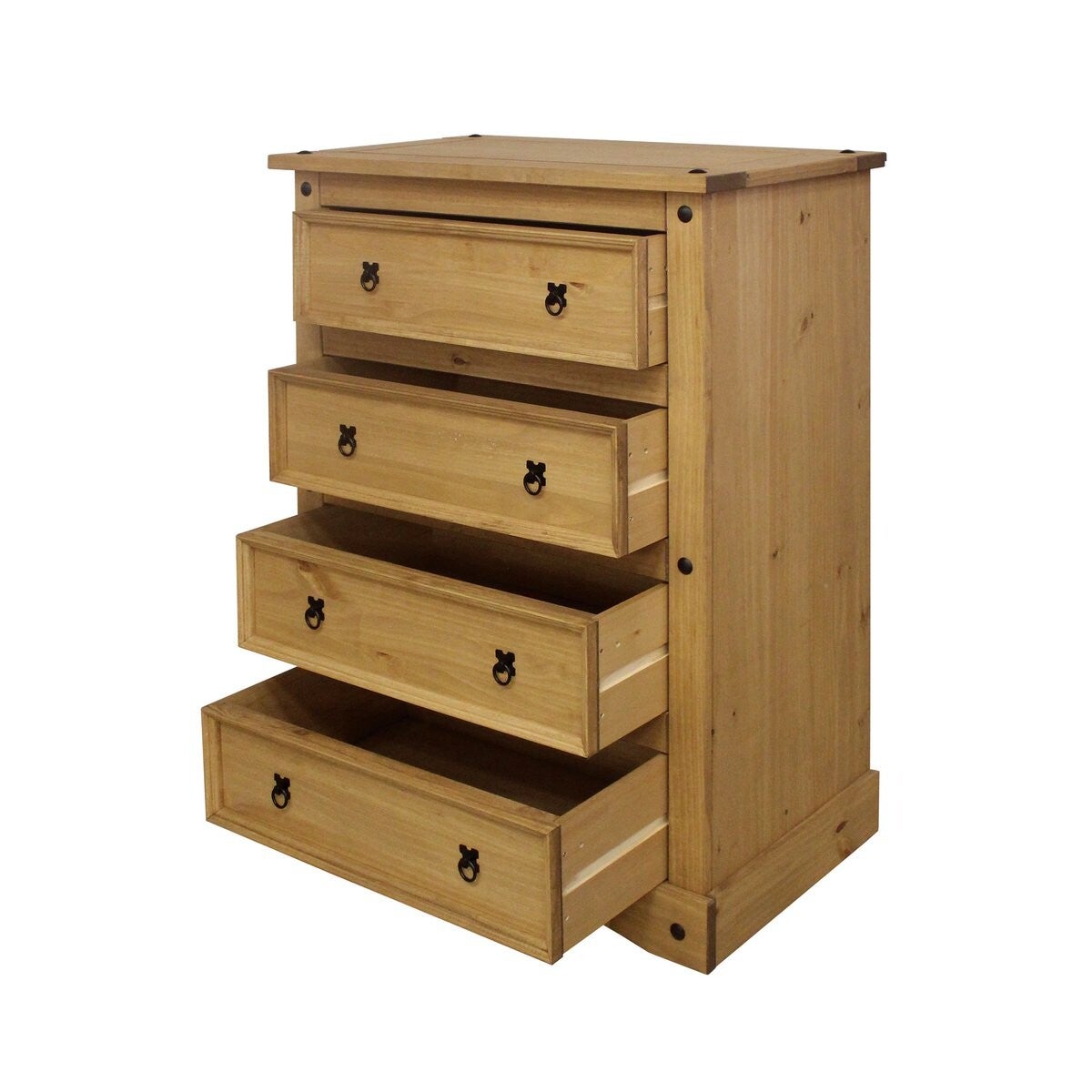 Deze elegante ladekast van massief grenen combineert natuurlijke schoonheid met functioneel design. Met vier ruime lades biedt hij veel opbergruimte en is hij een perfecte aanvulling op elke slaapkamer, woonkamer of hal. De ladekast is gemaakt van hoogwaardig grenenhout en wordt gekenmerkt door zijn robuustheid en duurzaamheid. Het natuurlijk gewaxte oppervlak benadrukt de warme nerf van het hout en geeft uw kamer een gezellige en uitnodigende sfeer. Zwart metalen beslag voegt stijlvolle accenten toe en geeft de ladekast een vleugje rustieke charme. De vier lades bieden royale ruimte voor kleding, accessoires, documenten of andere persoonlijke spullen. De solide constructie en zorgvuldige afwerking garanderen een lange levensduur en eenvoudige bediening van de laden. met zwart metalen beslag. meubel meubels kast