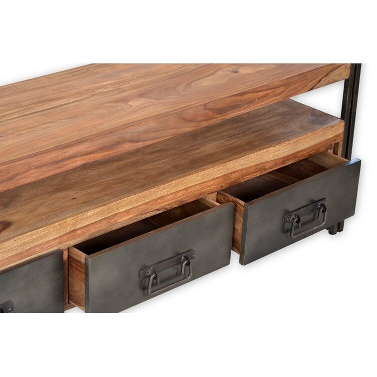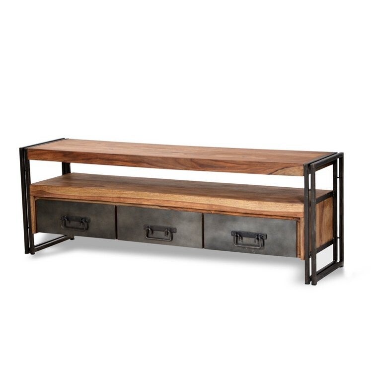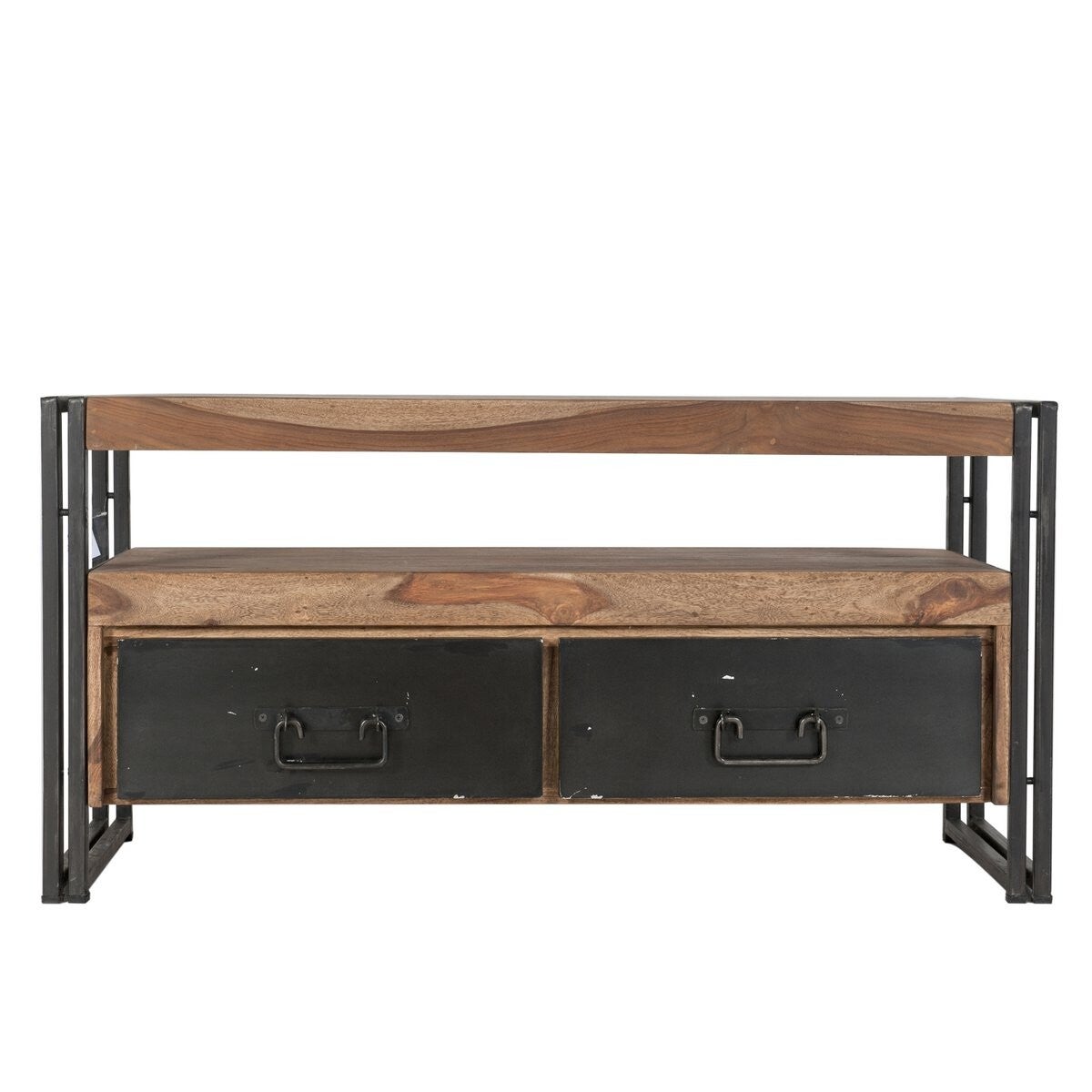 Dit kleinere tv meubel bied u de mogelijkheid om een luxe inrichting Massief acaciahout gecombineerd met industrieel metalen beslag in dit compacte dressoir. Met een breedte van 112 cm is er voldoende ruimte voor tv-toestellen. In het open vak is bovendien ruimte voor accessoires en andere hifi-apparaten. Dankzij de open achterwand is kabelgeleiding geen probleem. De houten body van acaciahout met sterke gebruikssporen wordt omlijst door een modern metalen frame. De industriële look wordt voortgezet door metalen bevestigingen aan de lades en handgrepen en maakt het lowboard tot een originele blikvanger. De structuur van het hout varieert van model tot model, waardoor elke plank uniek is met zijn eigen charme. Of het nu gaat om een blikvanger in een eenvoudige sfeer of als onderdeel van een moderne inrichting in fabrieksdesign: het dressoir is een chique aanvulling op vele woonstijlen. De moderne materiaalmix combineert een shabby en industriële look. Binnenlade: 42x30,5x15 cm, open vak: 102x40x17/13 cm. meubel kast meubels