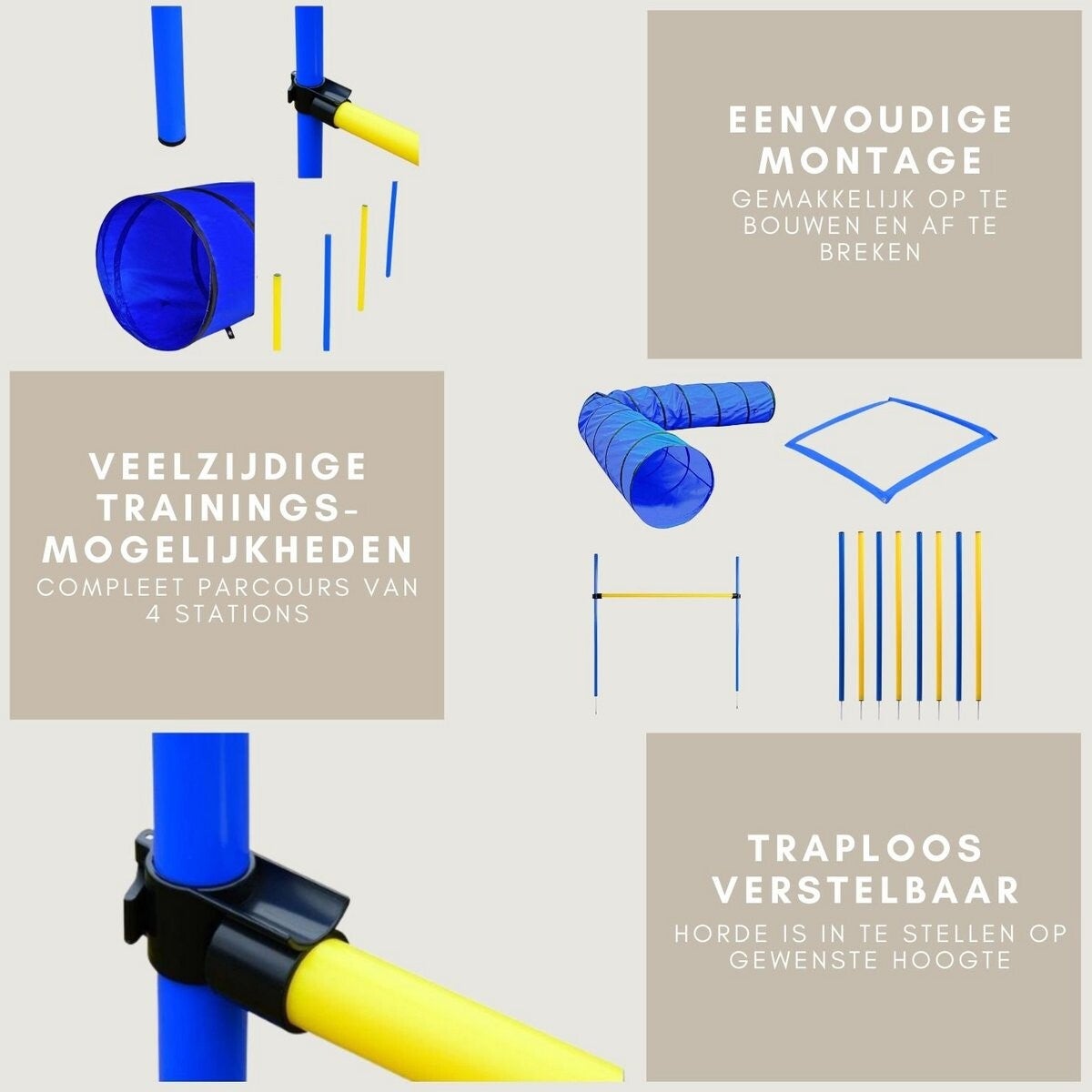 Tijd om samen plezier te maken, door je hond al spelend te trainen dankzij deze agility set voor honden. De set bestaat uit een parcours van vier stations: een tunnel, acht slalompalen, een horde set en een startveld. Boost het zelfvertrouwen en de fitheid van je hond dankzij de veelzijdige trainingsmogelijkheden van deze agility set.