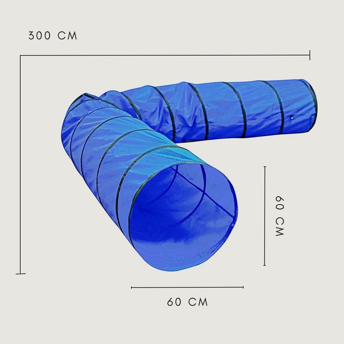 * Verkrijgbaar in maat M, L en XL (maat M heeft een tunnellengte van 160 cm, maat L een tunnellengte van 300 cm en maat XL heeft een tunnellengte van 500 cm). Aangeraden wordt om maat L of XL te bestellen voor honden met een gevorderd niveau op agility training. De tunnels van 300 cm en 500 cm kunnen namelijk in een hoek van 90 graden worden geplaatst, waardoor de hond het uiteinde van de tunnel nog niet meteen kan zien en daardoor meer uitdaging krijgt.