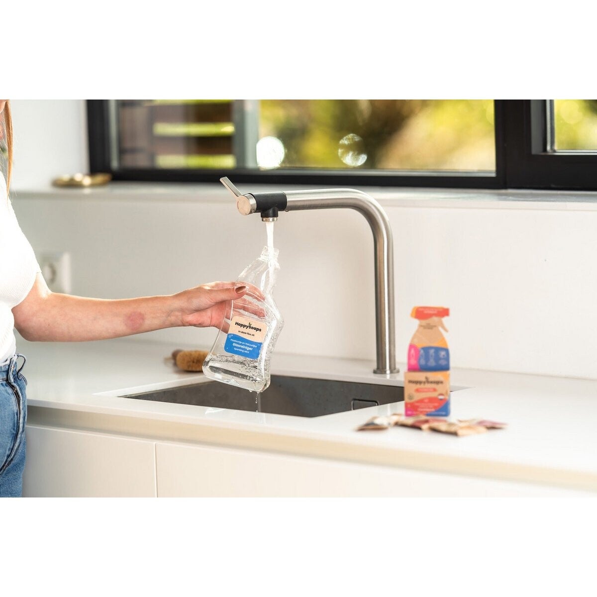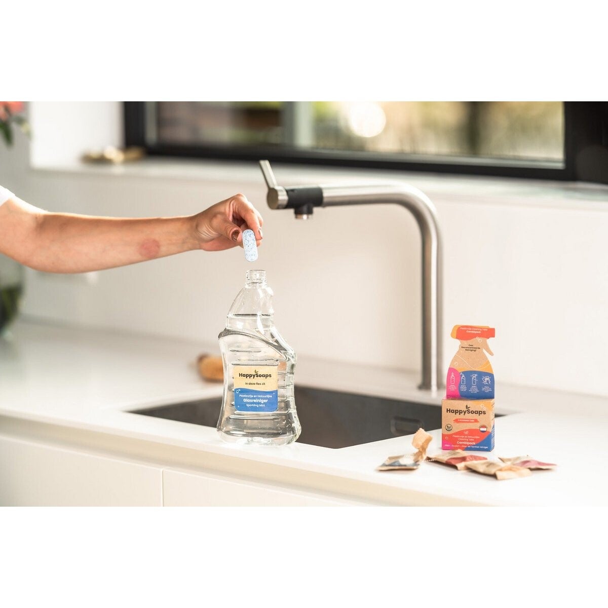 Voor de volledige schoonmaak Een combipack om het hele huis schoon te maken! In deze verpakking vind je een Allesreiniger, Keukenreiniger, Glasreiniger en Sanitairreiniger. Met deze Cleaning Tabs en wat kraanwater maak je binnen no-time je eigen plasticvrije en effectieve schoonmaakmiddel. Handige reinigers met heerlijk frisse geuren – wat wil je nog meer? Jouw fles + onze Tabs = schoon bezig!Stop met het betalen voor 80% kraanwater en het rondslepen van zware plastic flessen. Dit is de allereerste 100% plasticvrije schoonmaaklijn van Europa: HappySoaps Cleaning Tabs. Met slechts één Tab en wat water tover jij iedere plastic (spray)fles om in 750 ml aan supereffectief en geconcentreerd schoonmaakmiddel. 100% plasticvrij, vegan, natuurlijk en vrij van palmolie. Ontdek de toekomst van schoonmaken! Waarom overstappen op Cleaning Tabs?Ontdek hieronder 4 redenen waarom het plasticvrije alternatief veel beter is dan een traditionele plastic schoonmaakfles. 1) Zeer sterke en geconcentreerde reinigingOnze natuurlijke Cleaning Tabs bestaan uit geconcentreerde en effectieve natuurlijke ingrediënten. Zo is één spray voldoende voor een brandschoon resultaat. 2) 100% plasticvrijNooit meer plastic flessen schoonmaakmiddel kopen. Met onze Cleaning Tabs tover je namelijk iedere fles om in jouw eigen effectieve schoonmaakmiddel. Beter voor jou én de planeet. 3) Stukken goedkoperIn de verpakking zitten 3 HappySoaps Cleaning Tabs. Met 1 Cleaning Tab maak je in een handomdraai 750 ml aan effectief schoonmaakmiddel. Zo staat 1 verpakking gelijk aan maar liefst 3 flessen schoonmaakmiddel! Omgerekend een stuk goedkoper. 4) Natuurlijke schoonmaak: vegan en palmolievrijReguliere schoonmaakmiddelen komen niet alleen in een vervuilende verpakking, ook de inhoud is slecht voor het milieu. Met onze Cleaning Tabs is dit anders. De verpakking en de Tabs zijn helemaal plasticvrij, vegan, palmolievrij en bevatten natuurlijke ingrediënten. Voor een bewuste, vrolijke en natuurlijke schoonmaak. Hoe gebruik je de Cleaning Tabs? Vul een fles met max. 750 ml water. Voeg één Cleaning Tab toe. Wacht ca. 10 minuten tot de Tab is opgelost. Even schudden en voilà! Klaar voor heel wat schoonmaakbeurten. Gemaakt in NederlandLokaal geproduceerd met liefde. De Cleaning Tabs van HappySoaps komen gewoon uit Nederland, waar wij ze liefdevol maken. zeep schoonmaak was