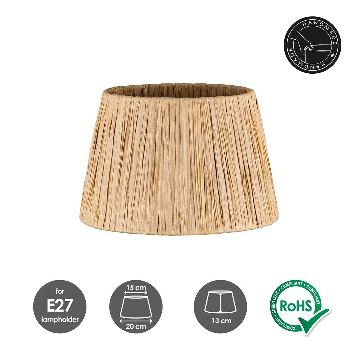 • Handgeweven van natuurlijke raffia voor een zachte, warme lichtuitstraling die een gezellige sfeer onmogelijk maakt. • Veelzijdig gebruik: Geschikt voor tafellampen, Pendellamp, en diverse interieurstijlen. • Afmetingen: Diameter van 20 cm aan de onderkant, 15 cm aan de Bovenkant en een Hoogte van 13 cm. • E27 fitting: Eenvoudige installatie met een compatibele E27 fitting voor diverse lampen.