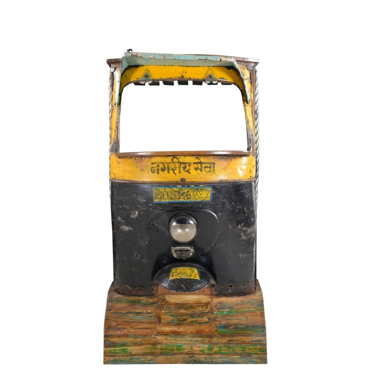 Stadsrondleidingen door de straten van Vietnam, de betoverende geuren van diverse eetstalletjes op straat en het ervaren van de Aziatische cultuur - met deze barkast gemaakt van een gerecyclede tuk-tuk komt een stukje Aziatische vakantie thuis. Tuk Tuks zijn kleine autoriksja's die in Azië worden gebruikt om mensen en goederen te vervoeren. De rustieke voertuigen danken hun naam aan het typische motorgeluid van de tweetaktmotoren dat voorheen gangbaar was. De zwart-gele metalen voorkant van de barkast doet denken aan bekende taxi's uit grote steden over de hele wereld. De voorkant van de tuk tuk is gecombineerd met kleurrijk beschilderd oud hout. Achterin bevindt zich een volledig uitgeruste barkast met houders voor zes glaswerk, twee lades en planken voor tien flessen. Het voormalige voorraam doet dienst als luik. Deze barkast is de ideale aanvulling op originele inrichtingsconcepten in moderne fabrieks-chic en is gegarandeerd een blikvanger als thuisbar of in een stoere gastro-sfeer. gerecyclede tuk tuk - voorkant. meubels bar meubel