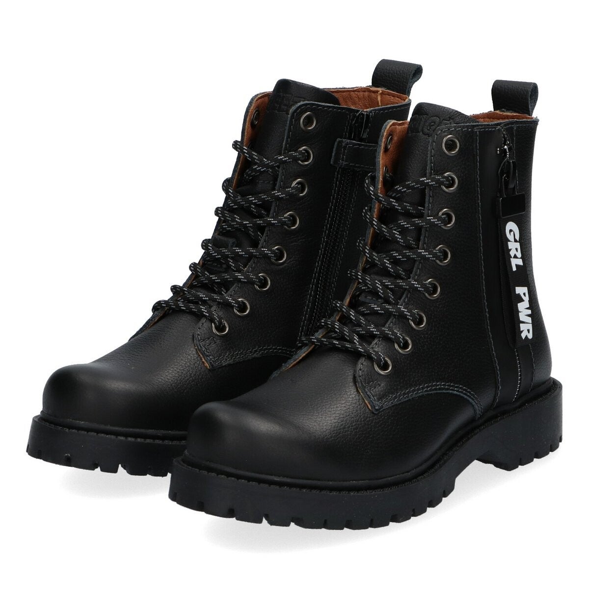 De veterlaarsjes zijn gemaakt van zwart leer en ze hebben een sierrits met een GRL PWR label. De laarsjes hebben een stoere rubberzool en ronde veters. Je trekt de biker boots gemakkelijk aan en uit met behulp van de ritssluiting. Klaar voor jouw volgende avontuur!