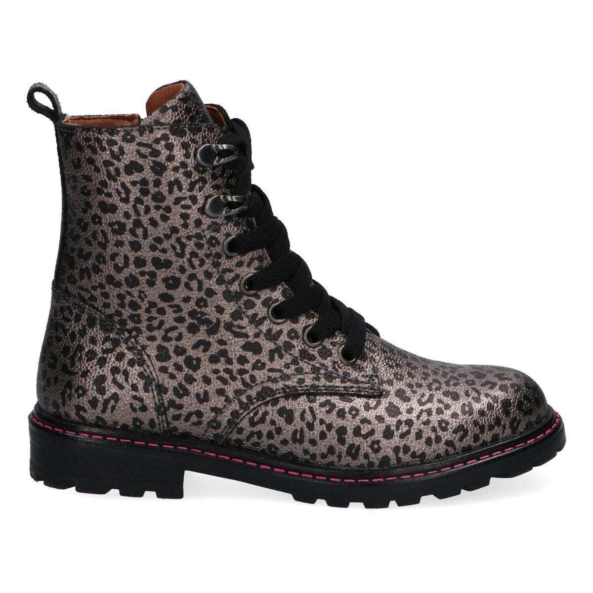 De veterlaarsjes zijn grijs en hebben een zwarte panterprint. De laarsjes hebben een stoere rubberzool. Met behulp van de ritssluiting trek je de boots gemakkelijk aan en uit, en met de veters zorg je ervoor dat ze goed aansluiten aan je voeten.