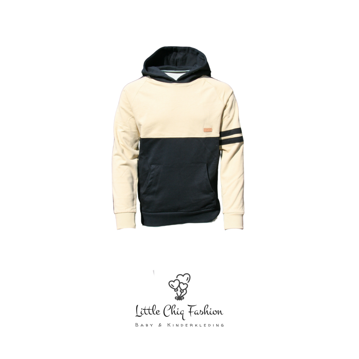 Deze zwart met zandkleurige hoodie krijgt een stoere twist met opvallende bies op de mouw. Lekker zacht, super comfortabel en perfect om in te chillen of buiten te spelen – een echte favoriet voor elke dag! kleding